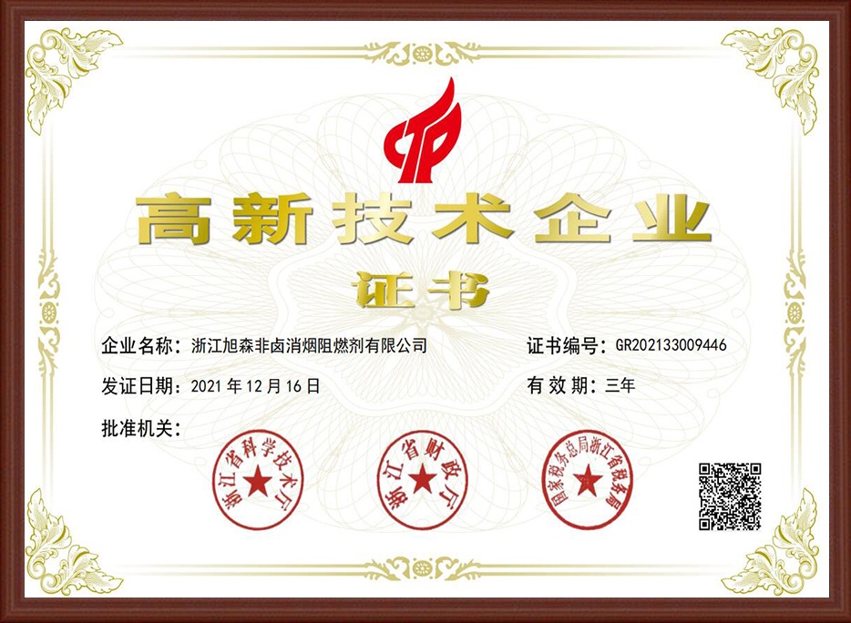 浙江旭森非卤消烟阻燃剂有限公司是上海旭森非卤消烟阻燃剂有限公司投资创立的,与专业研究院所合作,致力于研究开发非卤消烟环保类型阻燃剂。公司在原上海自新化工橡塑有限公司基础上于2003年创建,位于上海市松江区车墩镇工业区,于2006年通过了ISO9001:2000质量体系认证。2007年新建厂区位于浙江嘉善惠民街道成功路166号,于2009年9月试投产, 距上海浦东机场88公里,虹桥机场72公里,杭州92公里,毗邻沪杭高速和320国道,交通便捷。公司以研发为基础,开发符合WEEE、RoHs、EUP指令要求的安全、环保、绿色产品为宗旨。目前主要产品:环状膦酸酯、聚磷酸铵、硼酸锌、异氰尿酸蜜胺盐(MCA)、包覆赤磷、超细及活性氢氧化铝、氢氧化镁、超细季戊四醇, 各种丙烯酸压敏胶带用非卤阻燃剂,溶剂型及水性PU、PA织物涂层用非卤阻燃剂及粘合剂,玻纤网格布用非卤阻燃剂及粘合剂,PE、PP、EVA、PVC 用非卤消烟阻燃剂,硅橡胶专用非卤阻燃剂。产品均符合欧盟RoHs指令要求。公司坚持以诚信为本,质量第一、用户至上的理念,愿与新老顾客携手并肩,共创安全、环保、绿色的明天。公司宗旨:旭森人为您构建环保、安全、放心的明天!